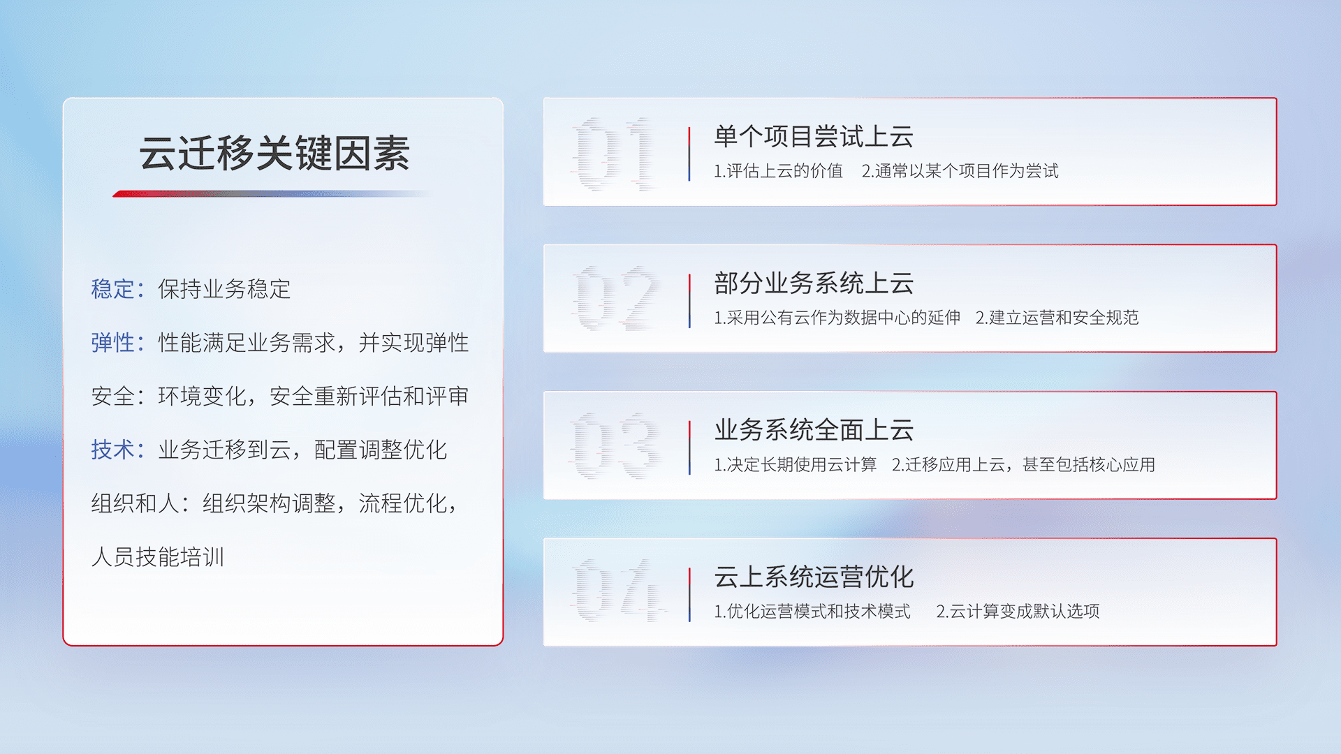 结合实际业务,,,从规划设计、、、云平台选型、、云原生改造、、、、数据迁移、、、集成交付,,,,迁移全过程为客户识别最佳上云路径,,做好风险识别管理,,设计网络架构、、、身份权限、、、、安全审计合规、、、、操作审计、、日志审计、、、、监控告警策略、、、、多站点容灾设计等,,,,对云上基础设施进行整体规划,,,提升IT治理水平,,,,以满足弹性、、、、高可用、、、高性能的需求。。。